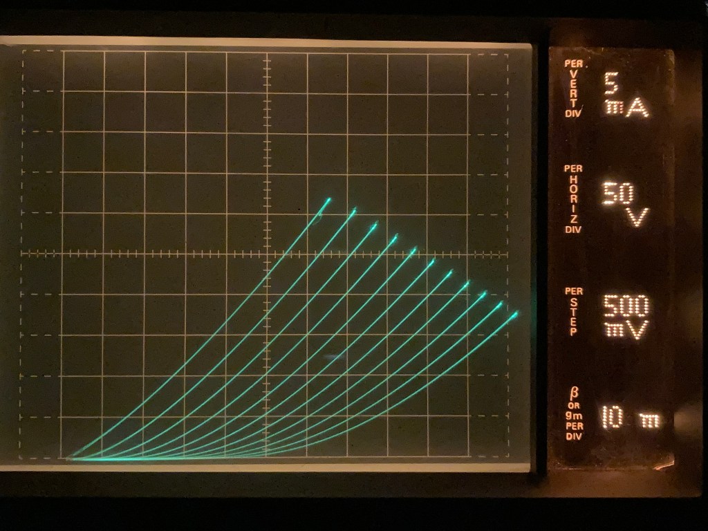 All of the pictures are taken on a Tektronix 576 Curve tracer, using a photo hood from [1] and a iPhone.